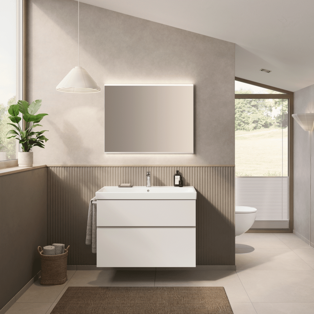 Het design van de collectie is strak en eigentijds, maar zonder uitgesproken karakter. Die neutraliteit maakt de producten breed inzetbaar, zowel in residentiële projecten als in professionele toepassingen. Tegelijk laat de collectie ruimte voor nuance. Verschillende afwerkingen – van mat wit en lava tot houtstructuren en meer uitgesproken kleuren – maken het mogelijk om zowel sobere als warmere badkamers te realiseren met de Caluna-oplossingen. De vormtaal blijft consequent: afgeronde wastafels, slanke meubelwastafels en opzetkommen met zachte geometrie zorgen voor een visuele rust die zich makkelijk laat integreren in uiteenlopende interieurconcepten.
